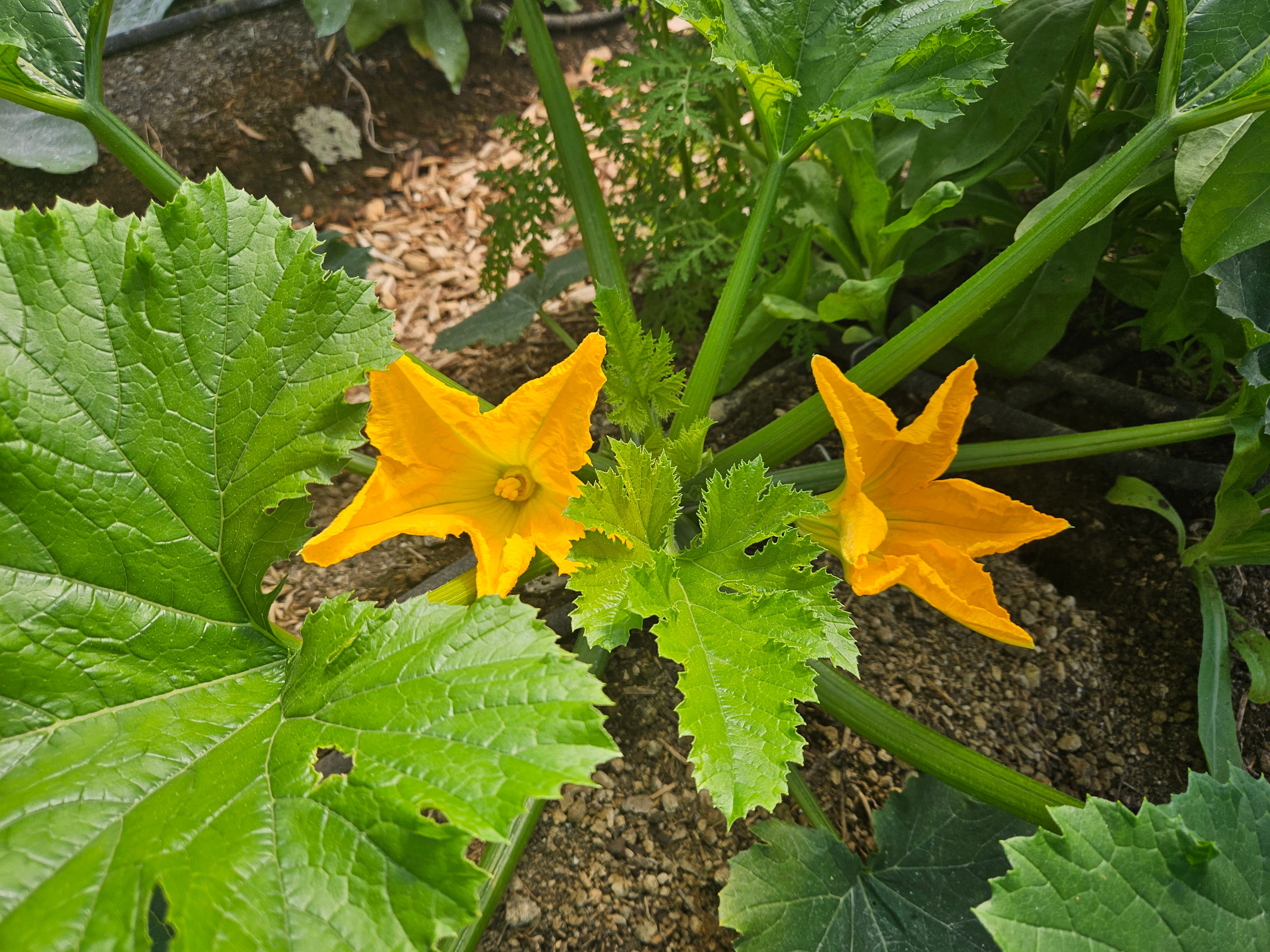 As with the selection of Desert for my zucchini plants, this yellow straightneck squash variety, Smooth Operator, was also selected primarily for its high powdery mildew resistance. The plants have an open bush growth habit, too, like Desert, and their squashes are spineless which provides a pain-free picking experience (so long as you avoid the spines on the petioles).