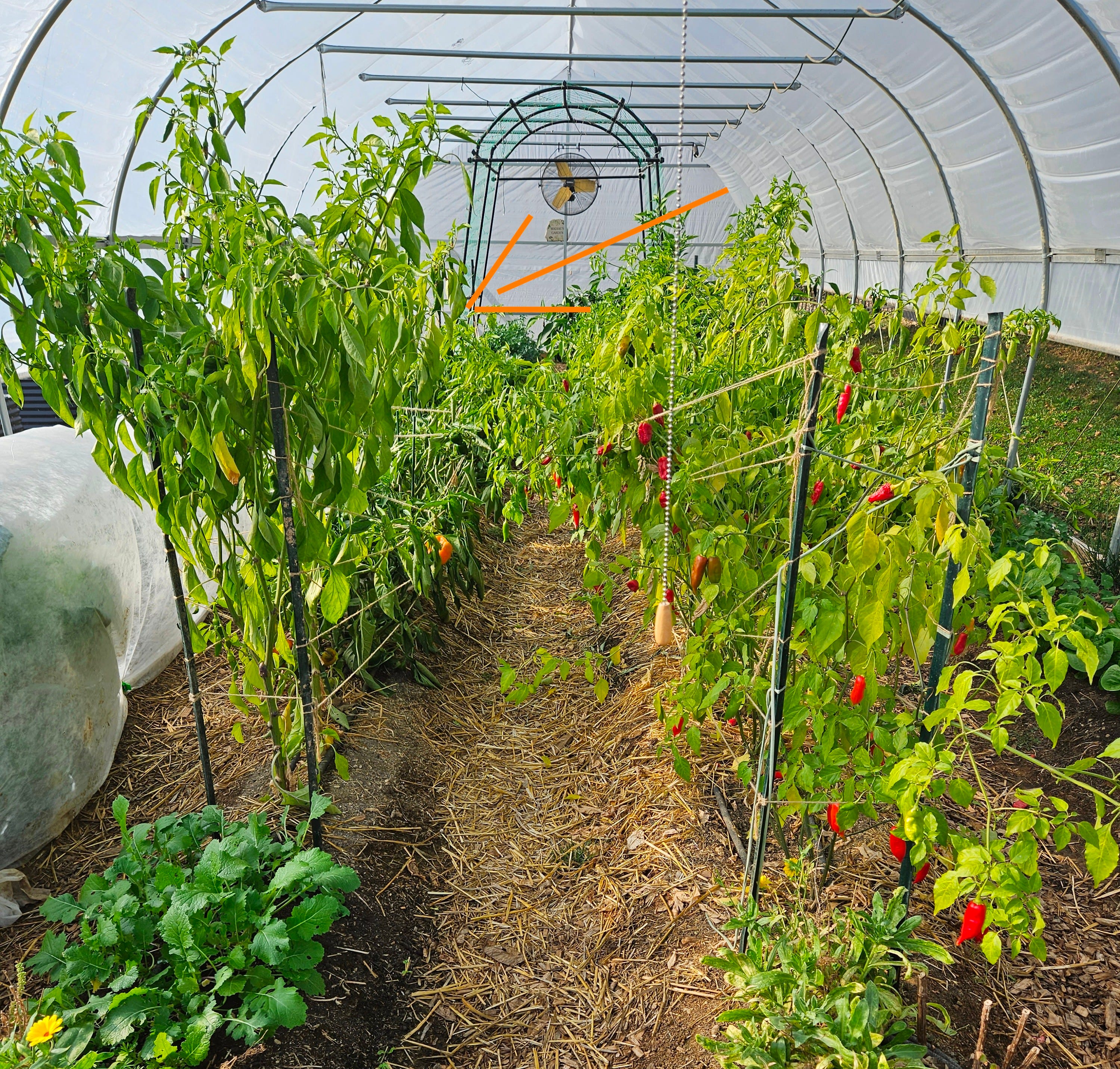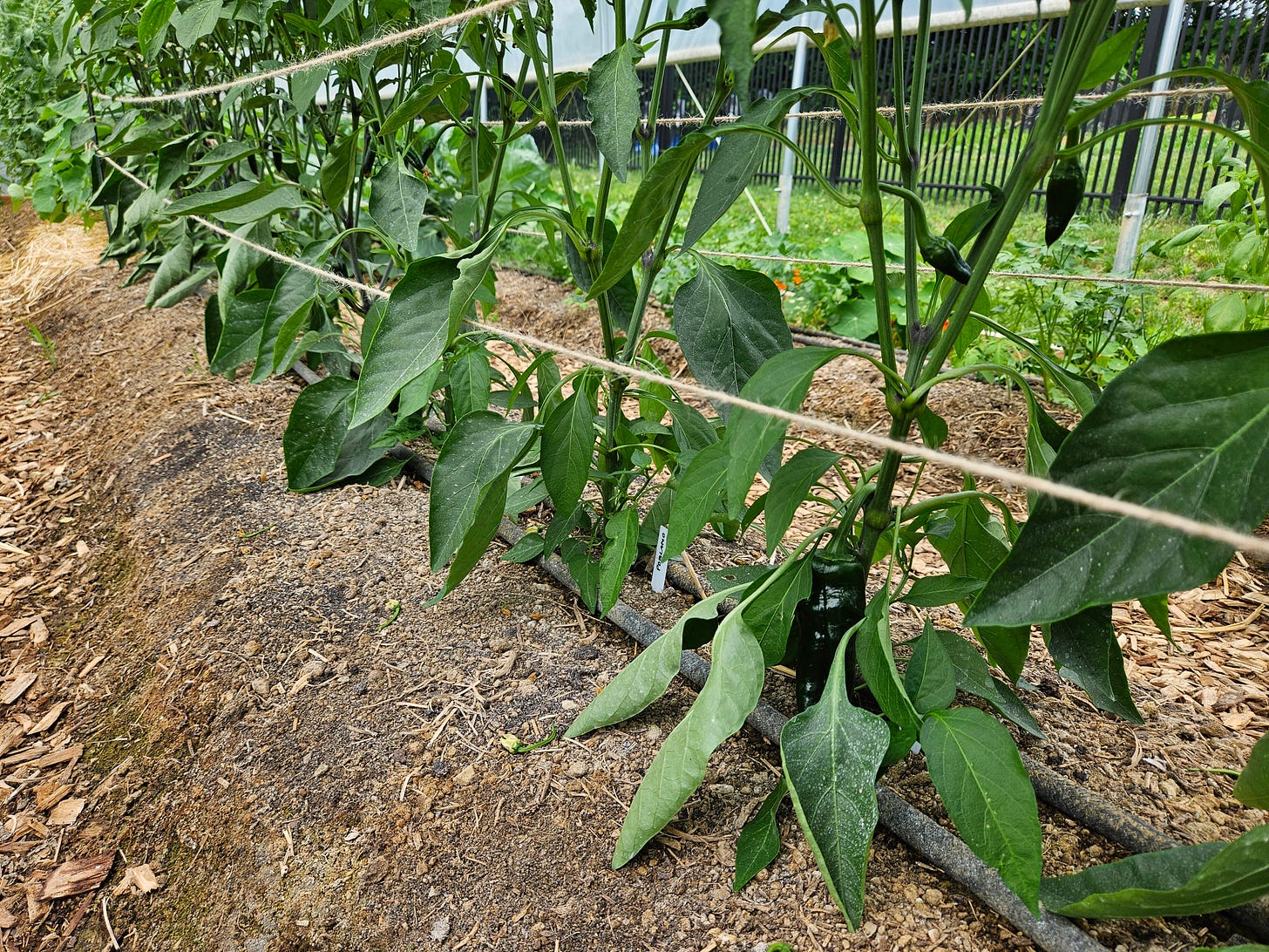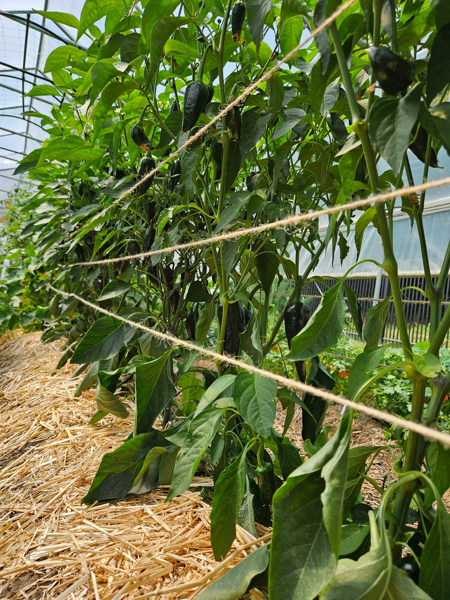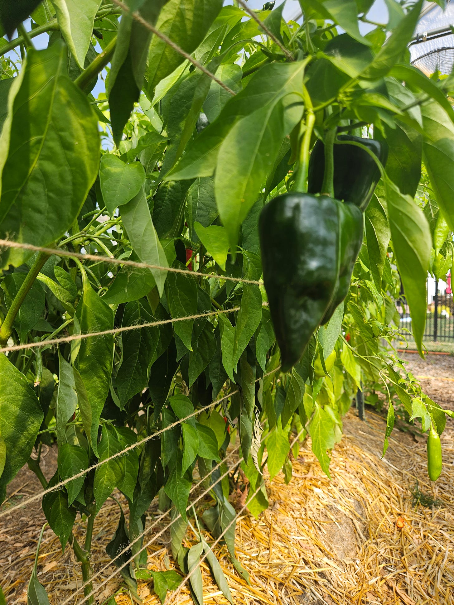 Next year, I plan to improve the system by placing t-posts at five-foot intervals along each row, which should help prevent the twine from sagging and offer better overall support. I’ll also be switching to taller t-posts. The ones I used this year stood four feet above the ground after being pounded in, but some of my pepper plants grew well over five feet tall (a height I didn’t even know they could reach!), causing them to spill over the top. The taller posts should help keep everything upright and more contained.