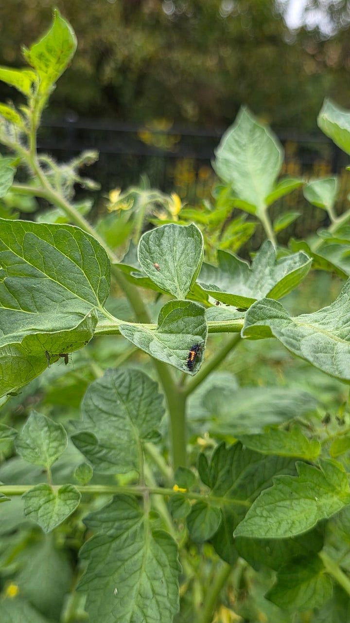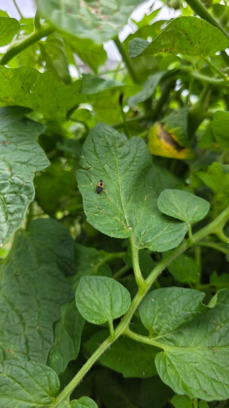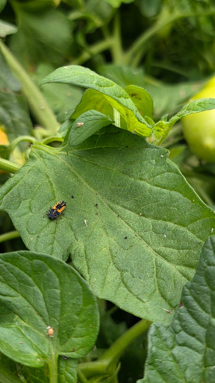 I noticed a couple of weeks ago that these determinate tomatoes have been infested with aphids. I don’t think I realized tomatoes could attract aphids. Before I could get together a plan to address the infestation, I noticed a ton of ladybugs and ladybug larvae amongst the foliage which I assumed were munching on the aphids. So, I have so far done nothing to try to control the aphid population because I want to provide the opportunity to the natural predators I attempted to cultivate with my flower patch first.