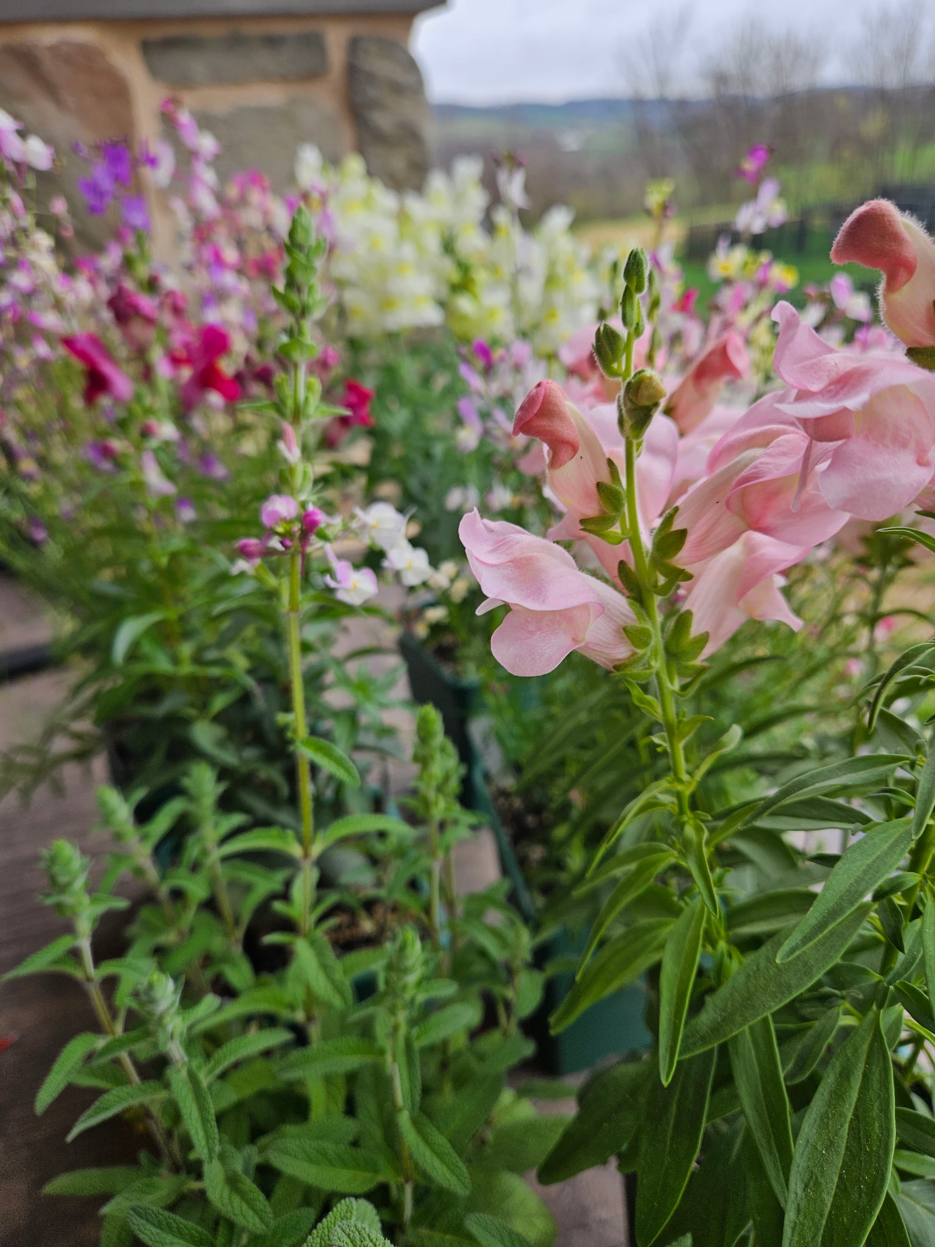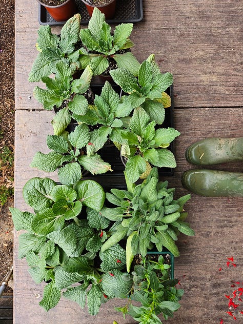 My snapdragon, salvia, calendula, licorice mint, lemon balm, mint, hollyhock, and borage plants have been consistently spending nights on the porch and will be transplanted outdoors within the next couple of days.