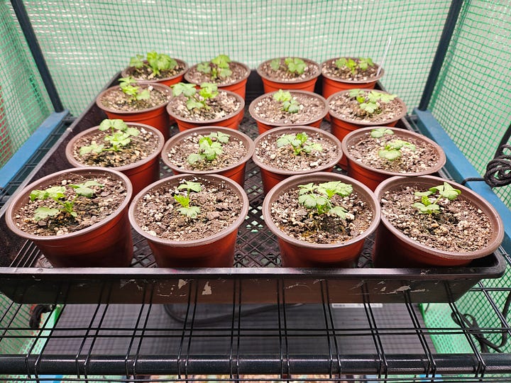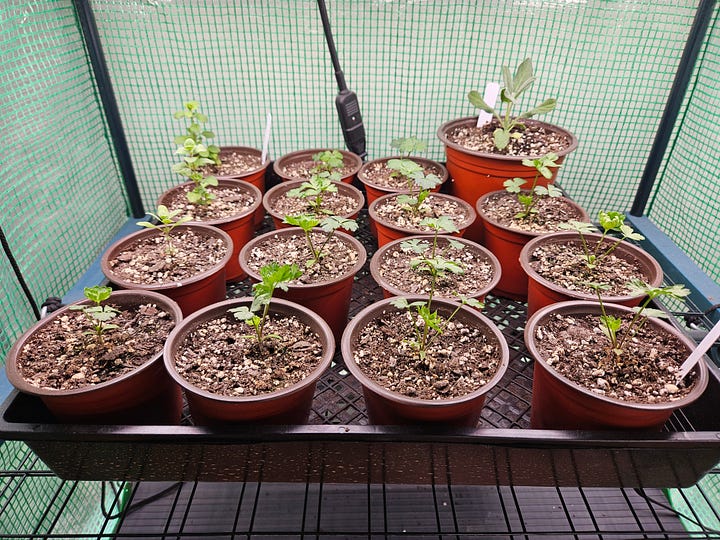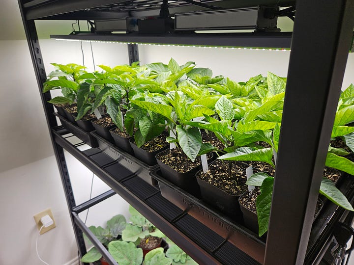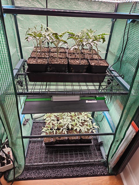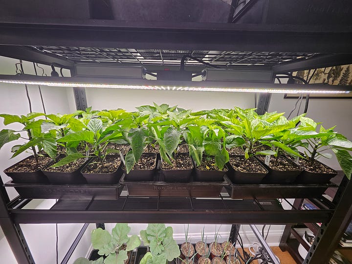 The eggplants and tomatillos are now in 6” pots while the tomatoes and basil just got upgraded to their first 4” pots. Thankfully, celery and parsley grow slowly and stay compact, because I’m completely out of space for larger pots. They can go outside a little earlier than the other summer crops. If the weather cooperates, I’ll transplant those next week.