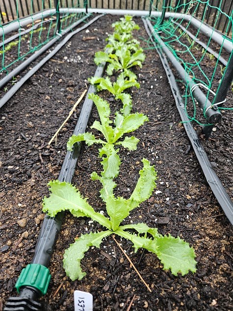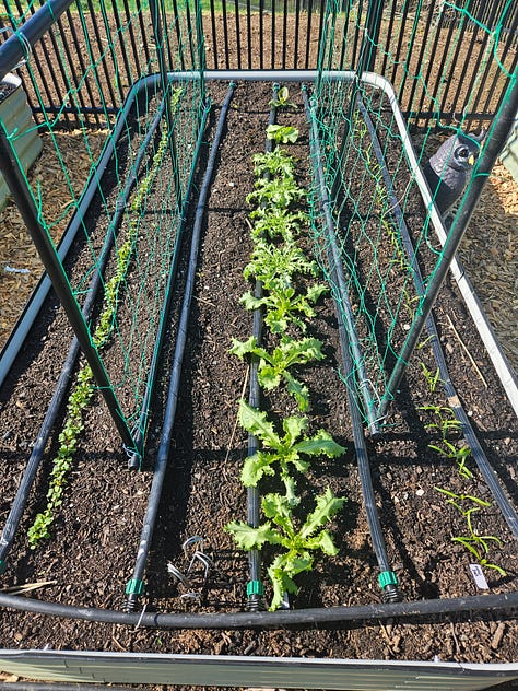 Most of the greens went into a single 8' x 4' raised bed. I tucked the two endive varieties between the cucumber trellises and planted the pac choi near my red onions. The idea is that the cucumbers will eventually provide dappled shade for the endives, while the onions might deter pests from the pac choi. I’m skeptical, but it’s worth a shot.