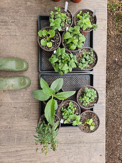 My borage, snapdragons, and salvias will all be moving into their permanent spots in the flower patch this week. Germination there has been excellent (yay!), but I’ll share more on that in the future. Once the rain lets up for a day or two, I’ll also finish installing the drip irrigation system in the corn patch. A few flowers and herbs in the nursery need potting up too.