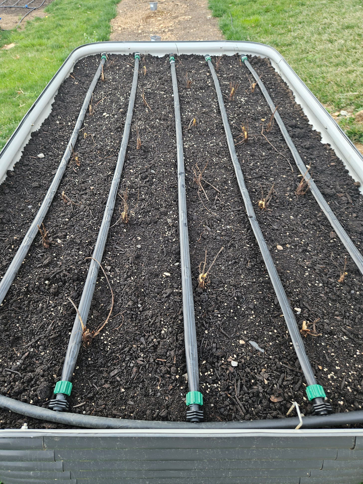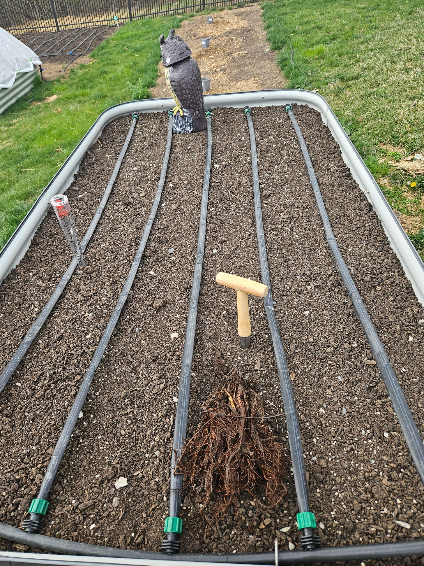 Besides planting potatoes and peas, I’ve got plenty to look forward to this week. The blueberry bed needs edging—not just to keep the grass out, but also to help the mulch stay where I want it. Blueberries benefit greatly from at least 2–3” of mulch (I’ll be using leaves, thanks again Terry!) to keep their roots cool, and a clean edge will make it easier to build up and maintain that layer. After edging and mulching, I can then set up their drip irrigation system.