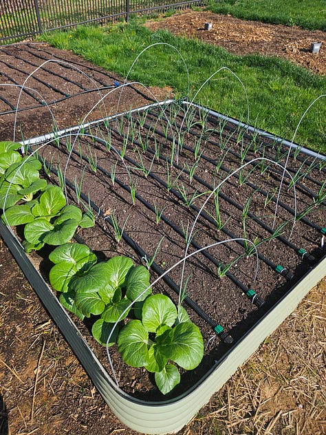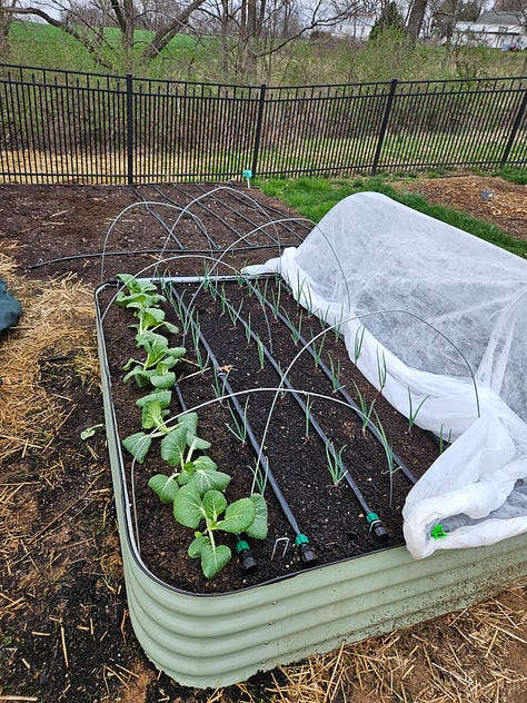 We had a couple of nights dip well below freezing, into the teens, so I covered my greens bed containing the sensitive romaine and iceberg lettuces with a plastic sheet as well as a frost blanket. The plastic completely excludes the cold winds that contribute greatly to freezing. For the other crops, including all of my alliums, I covered them only with frost blankets. In the mornings, when I removed the row cover, I was really happy to see that nothing sustained frost damage.
