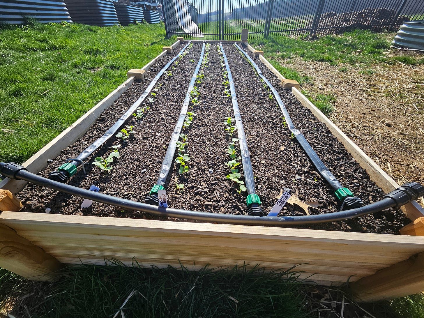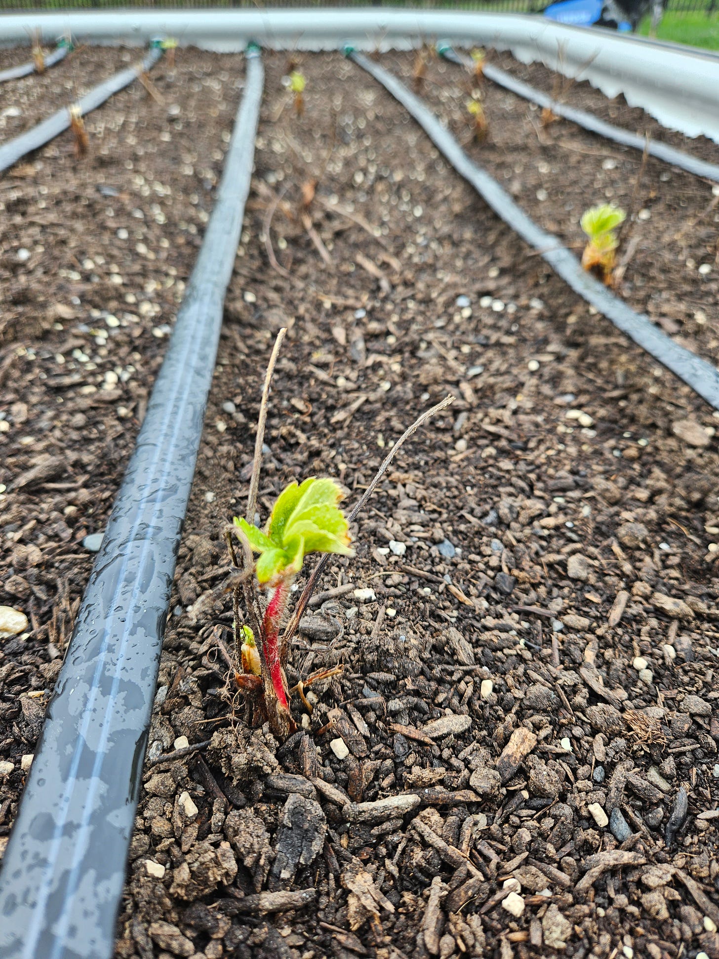 I spaced the plants about 16 inches apart, skipping one emitter between each. A few of the crowns looked a little weak, but I planted them anyway—hopefully, they’ll catch on. If not, I can always fill in the gaps later using runners from the stronger plants.