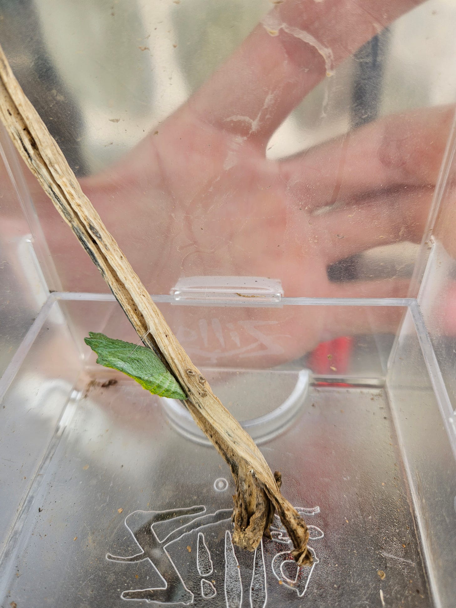 So far, it looks like it weathered the winter just fine. The chrysalis is still bright green and plump, and the silk hammock holding it to the celery stalk is intact. Black swallowtail butterflies usually emerge a bit later in spring, around late April to early May, but I’ve already started checking for signs of color change. When it’s almost time, the chrysalis will become mostly transparent, revealing the butterfly inside.