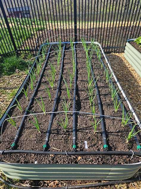 The alliums have grown so much that they’ve outgrown their low row cover of pest fabric, so I’ve removed it. At this stage, they can easily handle some pest pressure, but I’m leaving the hoops in for now in case of another hard freeze.